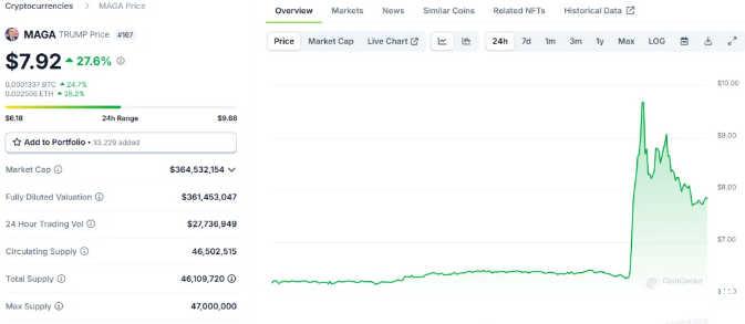 特朗普的meme币MAGA(Make America Great Again)也受此影响来了个暴涨: